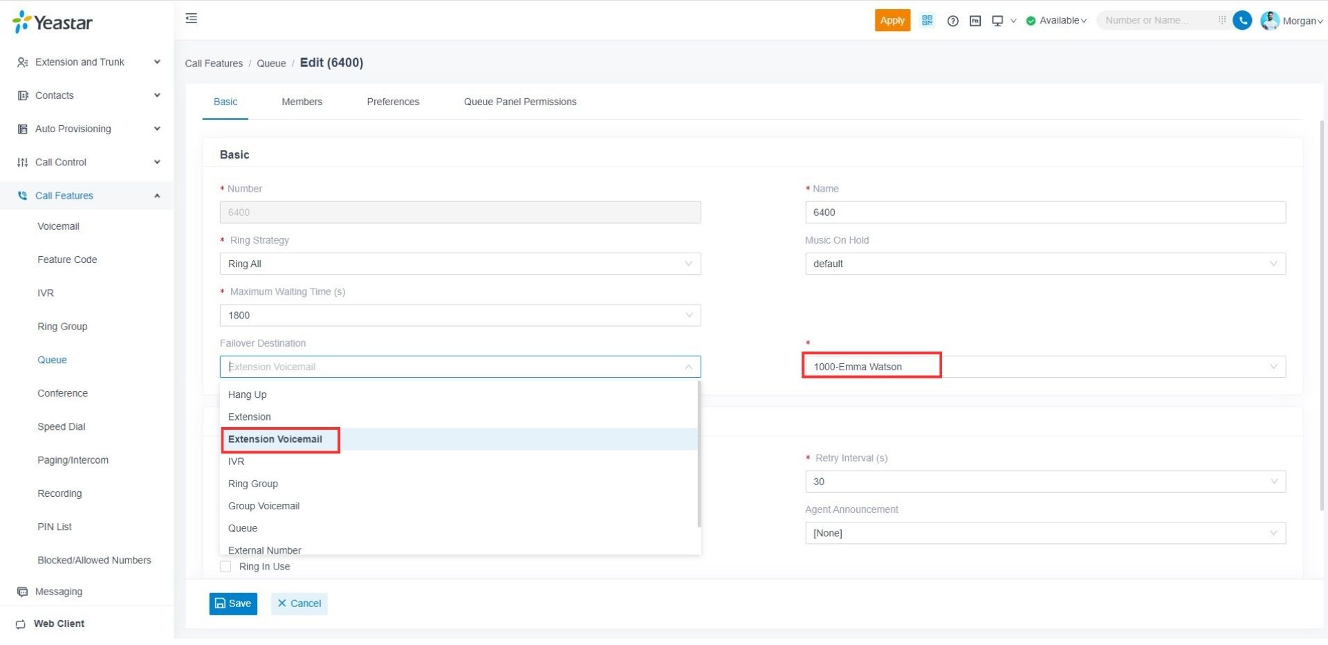 1. เข้าสู่ระบบเว็บพอร์ทัล PBX ตั้งค่าปลายทาง Failover เป็น Voicemail