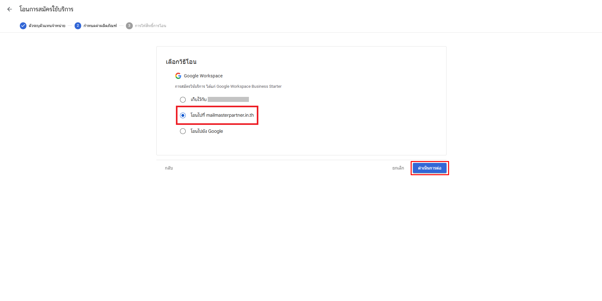 เลือกโอนไปที่ mailmasterpartner.in.th แล้วกดดำเนินการต่อ