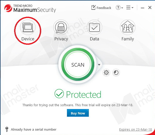 จะมีหน้าต่างขึ้นมาของโปรแกรม Protected by Trend Micro Maximum Security จากนั้นไปกดที่ Device