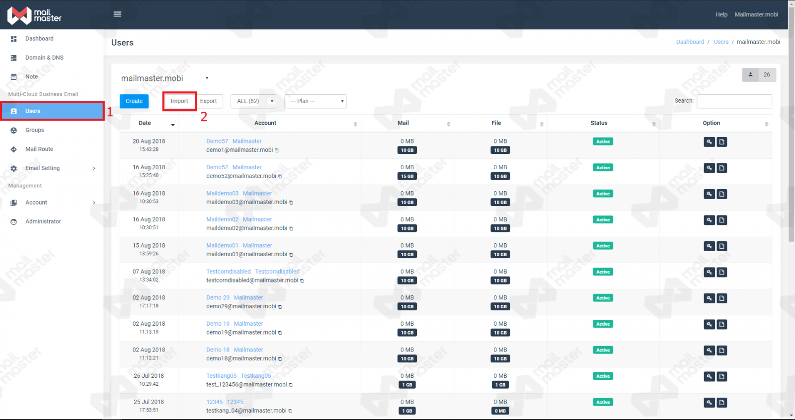 เลือกหัวข้อที่ต้องการ Import โดยจะมีตัวเลือก User, Password หรือ Manualโดยสำหรับหัวข้อ user จะต้องเลือก package plan ที่ใช้ก่อนที่จะ import รายชื่อ user
