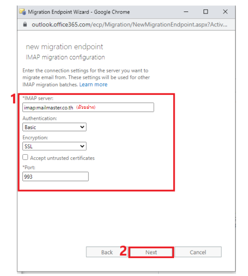 คลิกเลือก iMAP migration จากนั้นคลิก Next