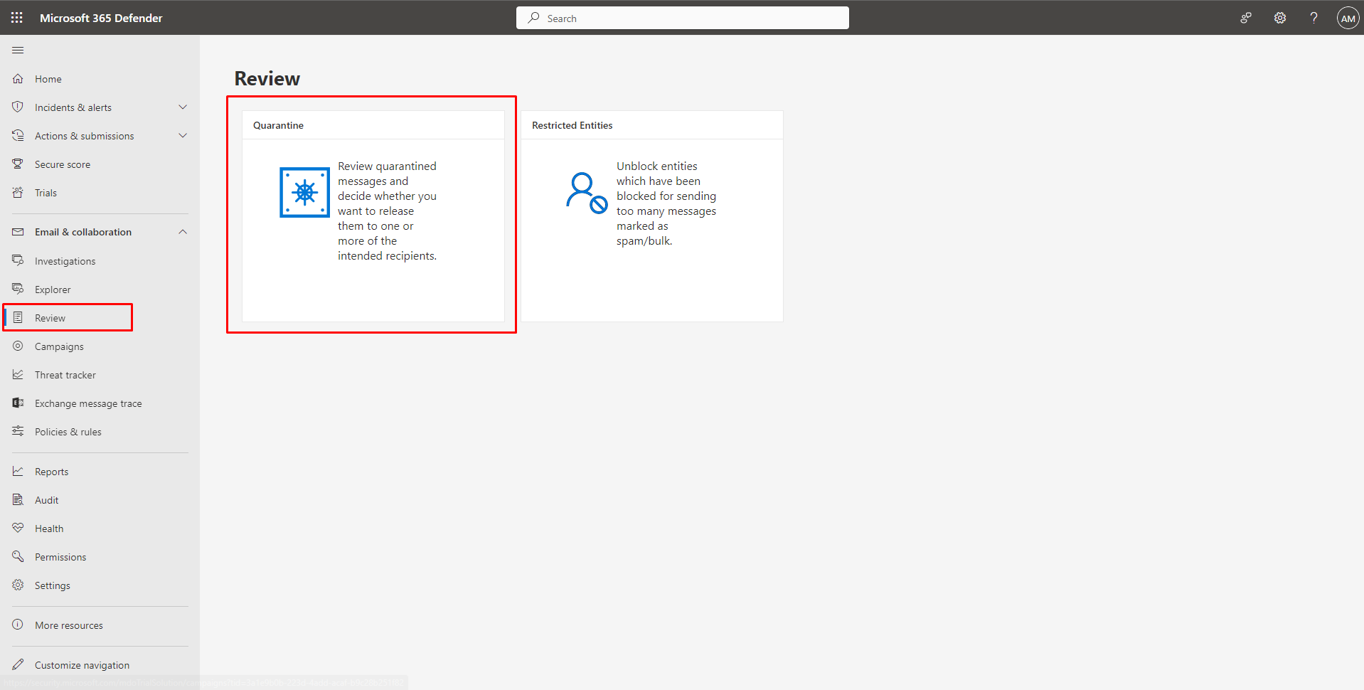 แถบด้านซ้าย คลิก Review จากนั้นเลือก Quarantine