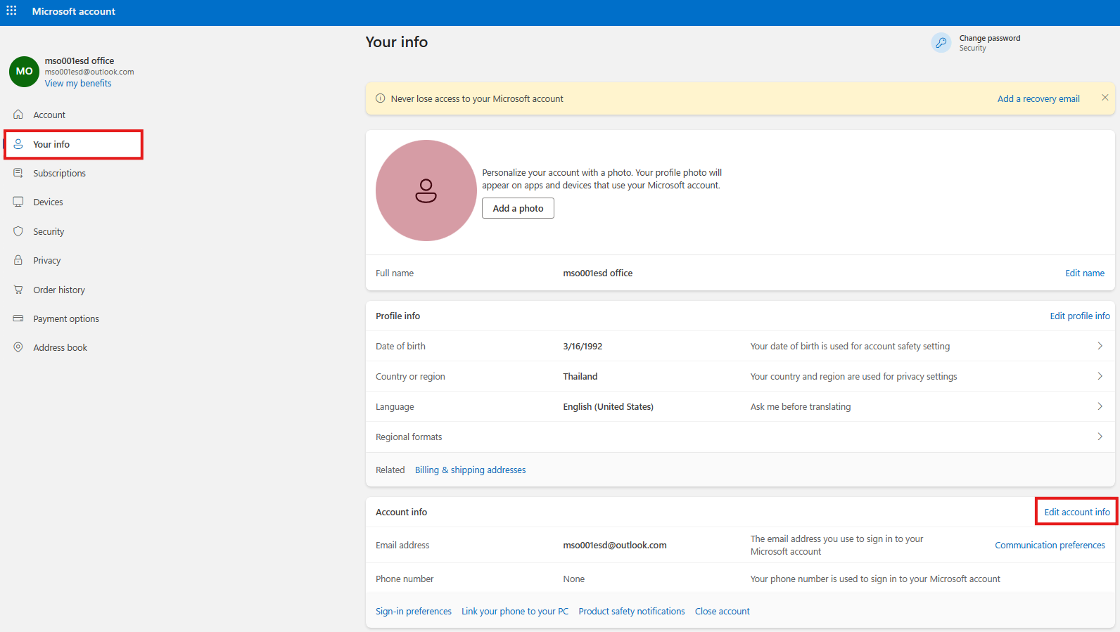 1.ทำการ Sign in และ เข้าหัวข้อ Your Info ด้านซ้ายมือ และคลิกที่ Edit account info