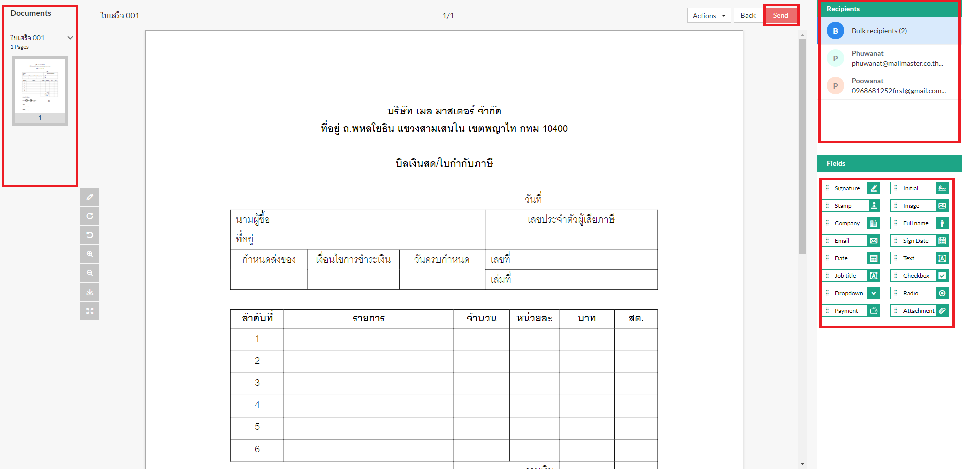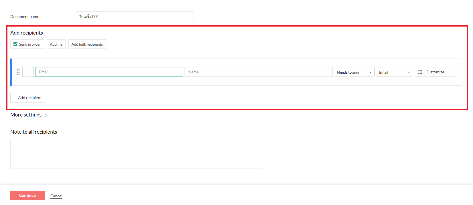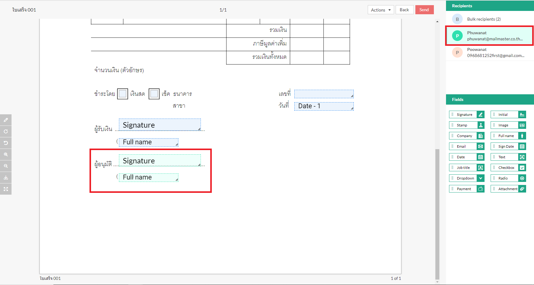 หลังจากตั้งค่าฟิลด์เอกสารสำหรับผู้รับแต่ละคนแล้ว