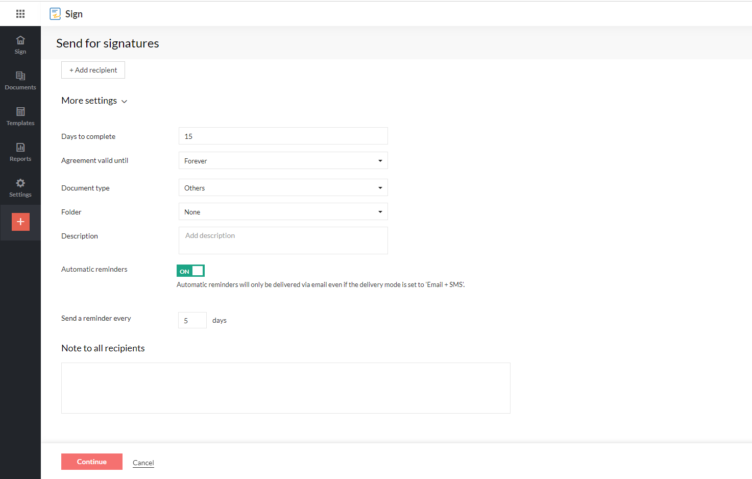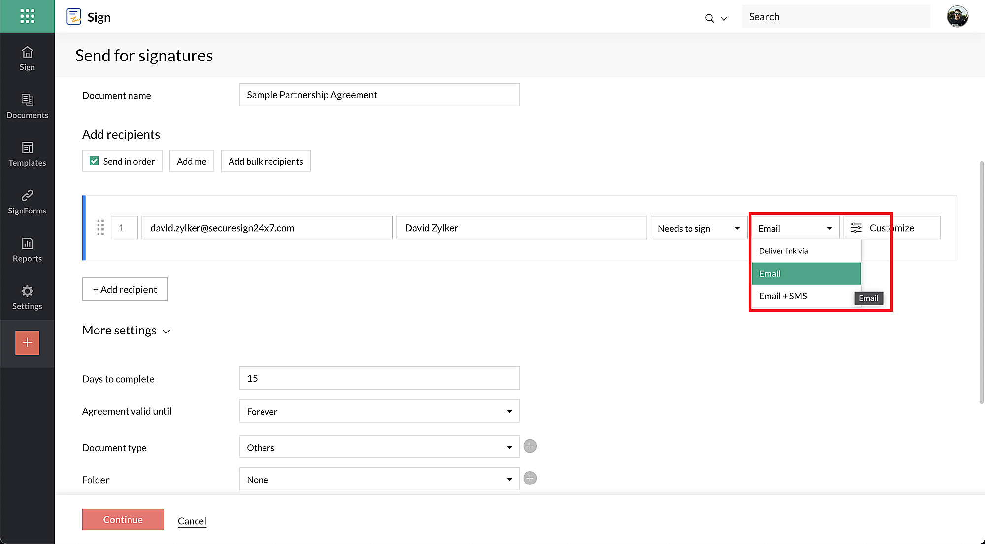 หลังจากที่คุณเพิ่มรายละเอียดผู้รับทั้งหมดแล้ว ให้คลิก Continue เพื่อดำเนินการต่อไปยังโปรแกรมดูเอกสาร