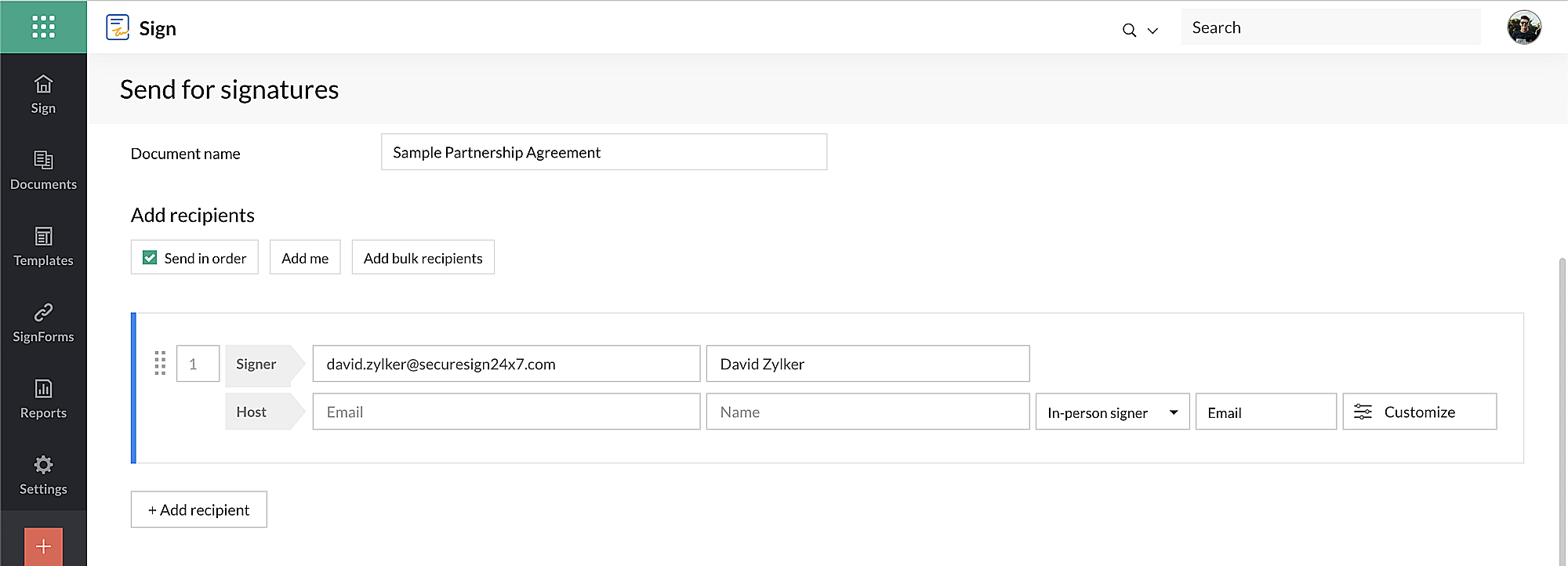3. In-person signer (ผู้ลงนามด้วยตนเอง) คุณต้องกำหนดโฮสต์จากองค์กรของคุณซึ่งจะได้รับเอกสารที่ลงนามด้วยตนเองจากผู้ลงนาม