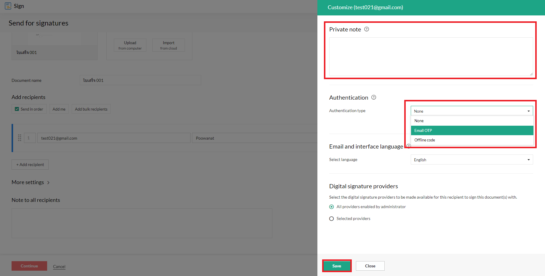 สามารถเลือกโหมดการจัดส่งเอกสาร โดยเลือกส่งเฉพาะ Email หรือเลือก Email + SMS
