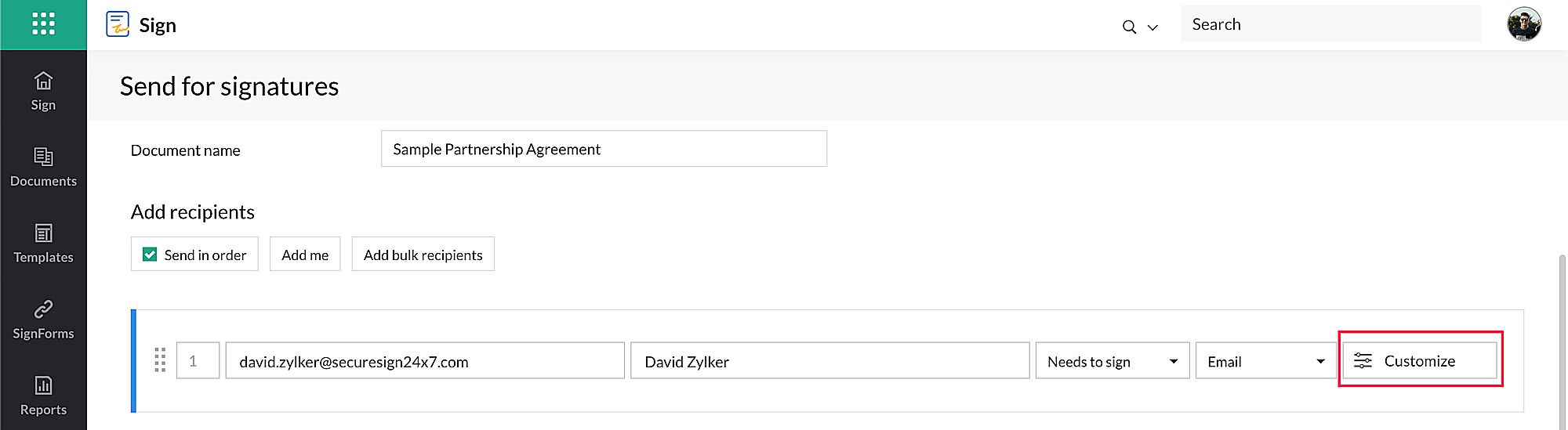 เข้าสู่ระบบบัญชี Zoho sign ของคุณแล้วคลิก Send for signatures
