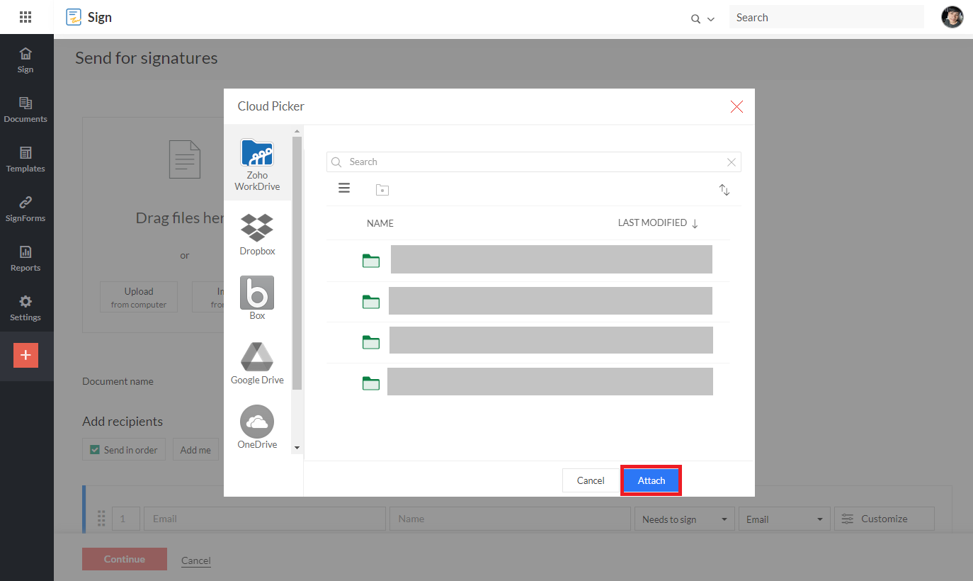 3. นำเข้าไฟล์จากบริการพื้นที่เก็บข้อมูลบนคลาวด์ เช่น Zoho Workdrive, Zoho Docs, Dropbox, Box, Google Drive และ OneDrive