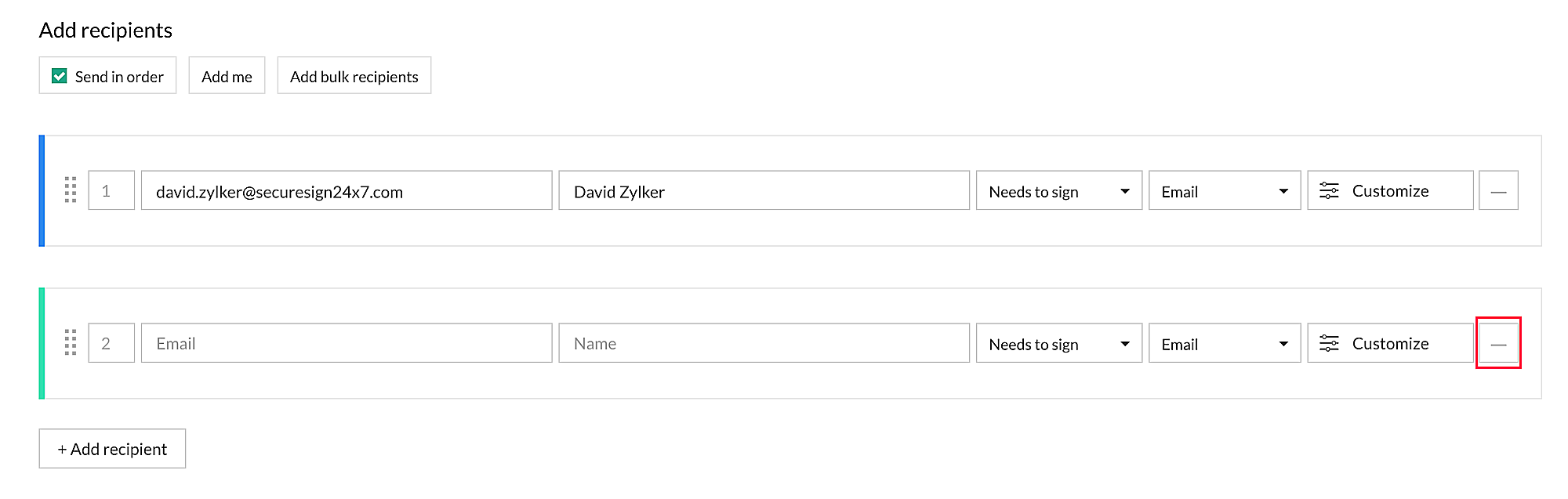6. หากต้องการลบผู้รับ ให้คลิกไอคอน ลบ - ที่ด้านขวาสุดของผู้รับที่เกี่ยวข้อง
