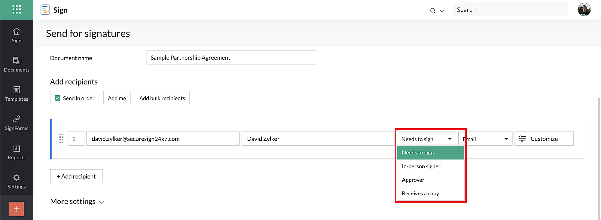 คุณสามารถอัปโหลดเอกสารและส่งไปยังผู้รับหนึ่งรายขึ้นไปเพื่อขอลายเซ็นโดยใช้ ส่วน Send for signatures ใน Zoho Sign